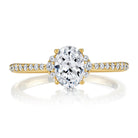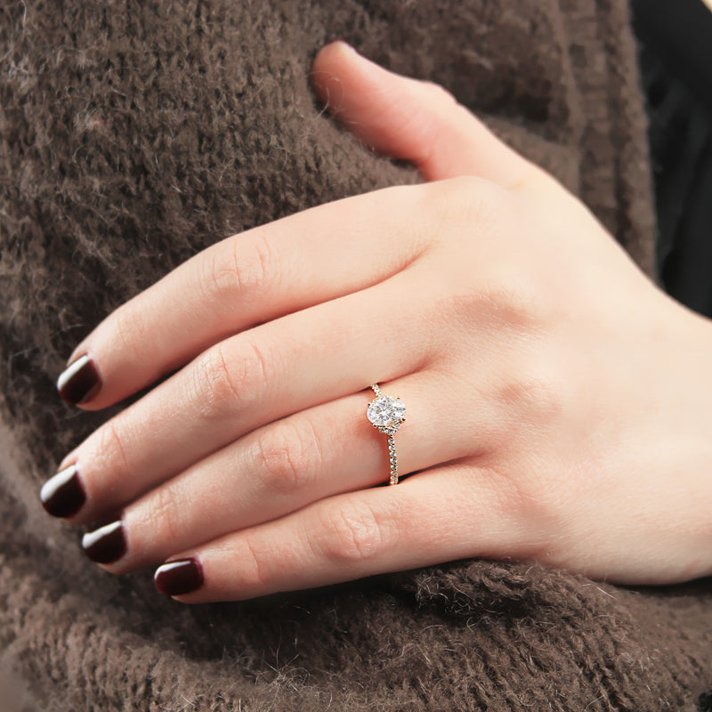 An oval brilliant center is accented with vertically set graduated diamonds on either side as well as halfway along the shank for an updated effect on a timeless piece. Stone Information: 22-RD 0.20, 02-TD 0.05. Available in Platinum, as well as 18K White, Yellow or Rose Gold.