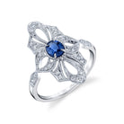 A vintage art deco inspired ring with a bright blue sapphire center from the Parade in Color Collection. Stone Information: 26-RD 0.24, 01-SA 0.42. Available in Platinum, as well as 18K White, Yellow or Rose Gold.