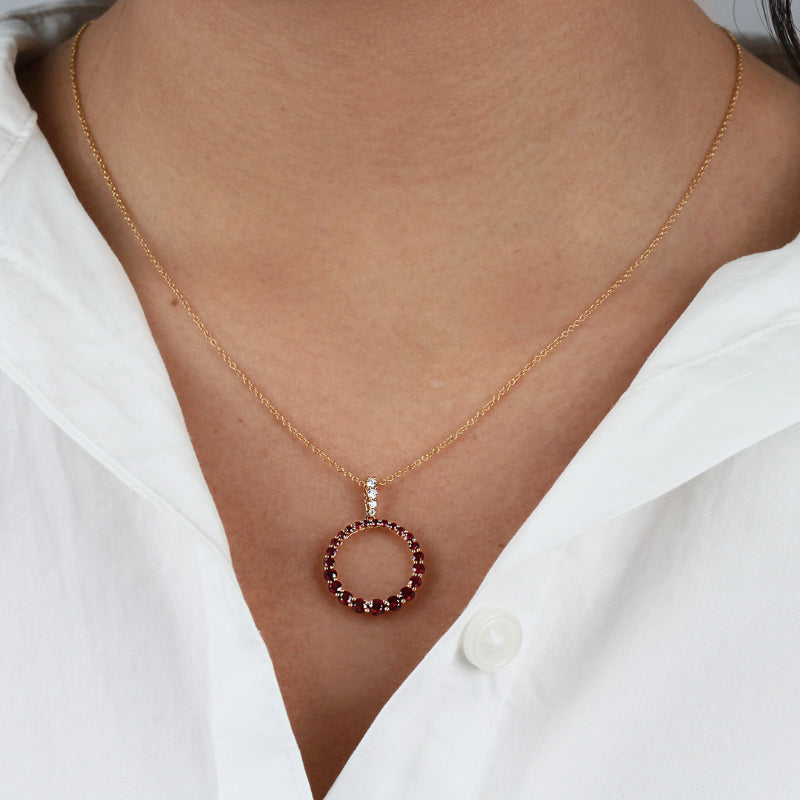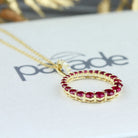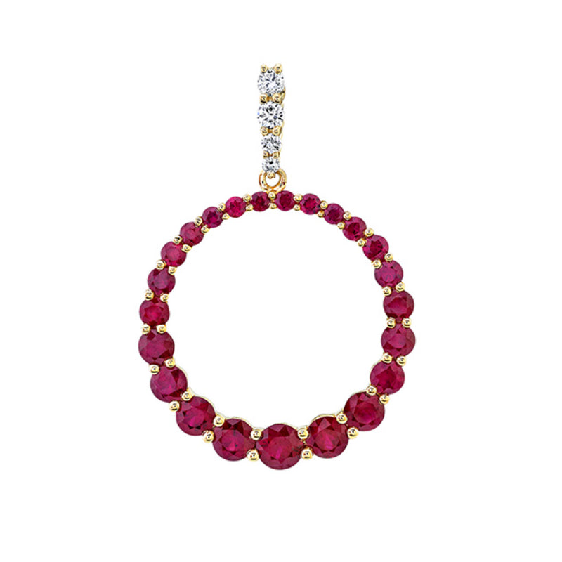 Festive and spirited, this circular pendant features a graduation of fiery rubies. Stone Information: 04-RD 0.09, 23-RU 1.24. Available in Platinum, as well as 18K White, Yellow or Rose Gold.