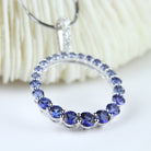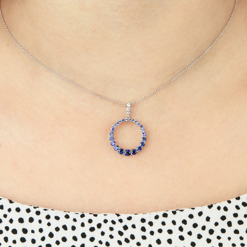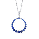 A gorgeous white gold circle pendant features vibrant blue sapphires connected to a shimmering diamond bail. Stone Information: 04-RD 0.06, 23-SA 1.06. Available in Platinum, as well as 18K White, Yellow or Rose Gold.