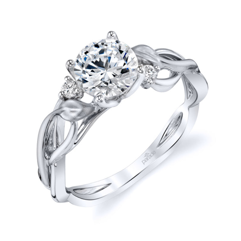 A brilliant center stone sits atop diamond accents along intertwined branches of high polished 18K gold and warm Lyria Leaves in this organic design from the Lyria Bridal collection. Stone Information: 02-RD 0.05. Available in Platinum, as well as 18K White, Yellow or Rose Gold.