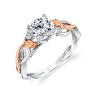 A brilliant center stone sits atop diamond accents along intertwined branches of high polished 18K gold and warm Rose Gold Lyria Leaves in this organic design from the Lyria Bridal collection. Stone Information: 02-RD 0.05. Available in Platinum, as well as 18K White, Yellow or Rose Gold.