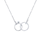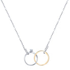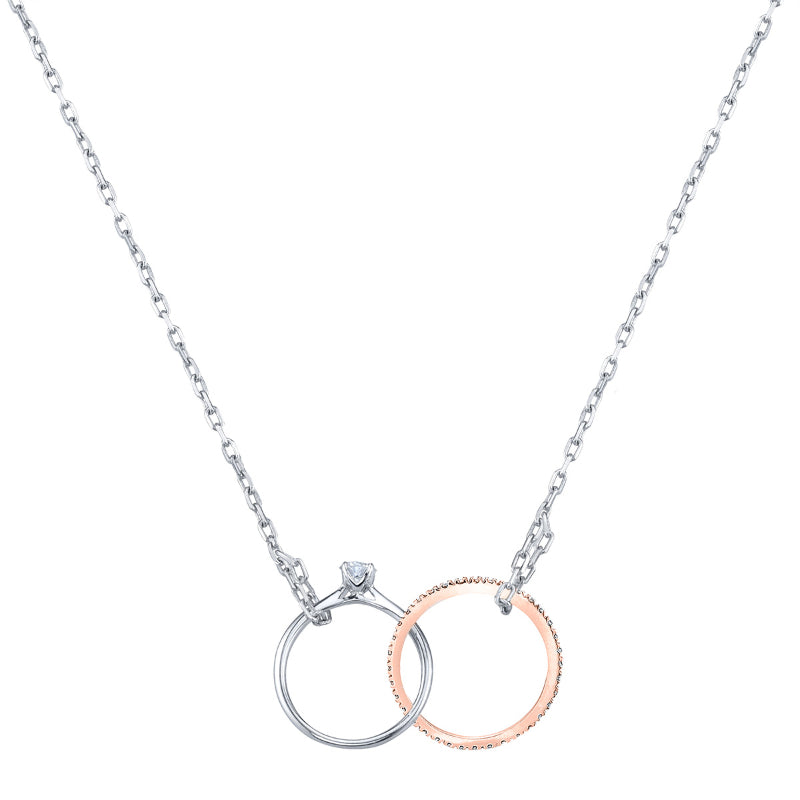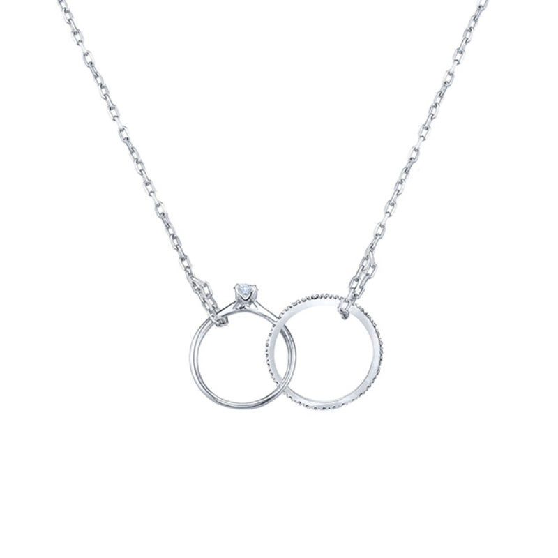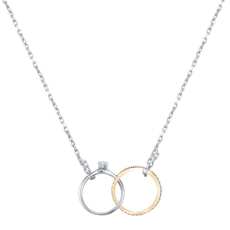 A miniature wedding set to be worn around the neck: featuring a classic solitaire with a brilliant round diamond set in the Signature LYRIA Crown interlocked with diamond eternity band, suspended from a chain of fine link gold. Stone Information: 36-RD 0.07, 01-RD 0.06. Available in Platinum, as well as 18K White, Yellow or Rose Gold.