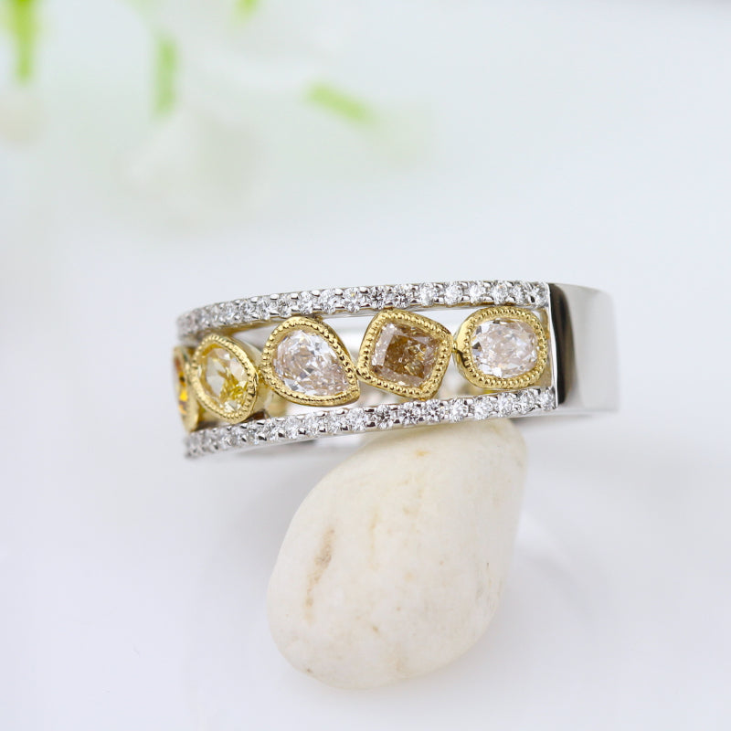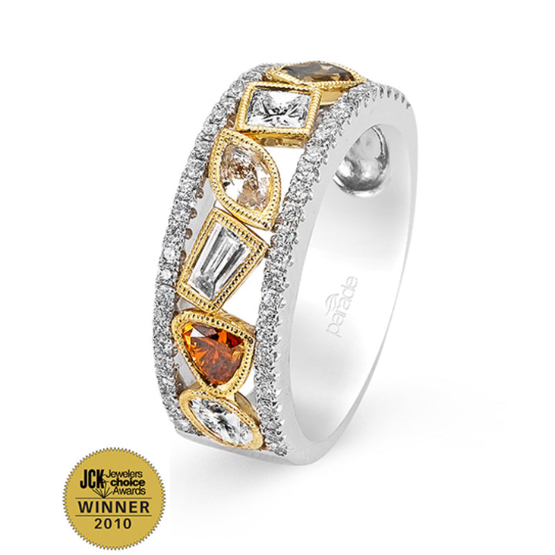 JCK Jewelers' Choice Award Winner 2010: A playful mixture of fancy diamonds boasts a spectrum of colors in this award-winning band including rich golden tones, deep amber and flashes of champagne. Stone Information: 60-RD 0.35, 07-FD 1.30. Available in Platinum, as well as 18K White, Yellow or Rose Gold.